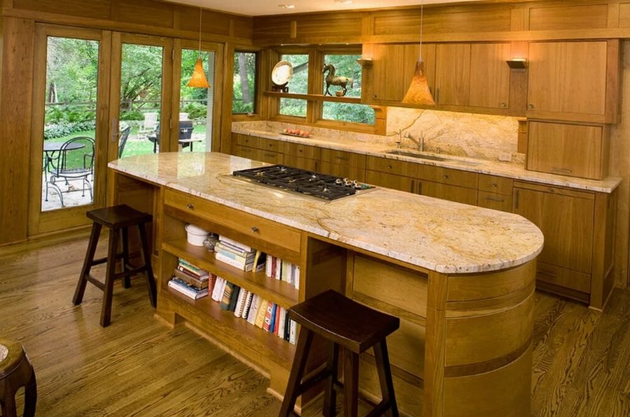 Очень монументально и респектабельно выглядит кирпичная кладка. В этом случае предпочтительнее использовать облицовочный кирпич. Как правило, он используется для оформления островной барной стойки на кухне. В этом случае столешница для кухни должна быть из камня, постформинга или массивной доски.