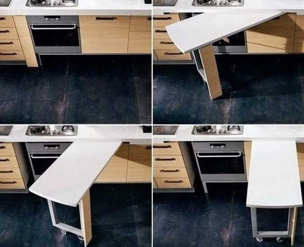 Увеличение рабочей поверхности происходит за счет раскладных механизмов. В разложенном состоянии они опираются на специальные складные ножки или фиксирующий механизм.