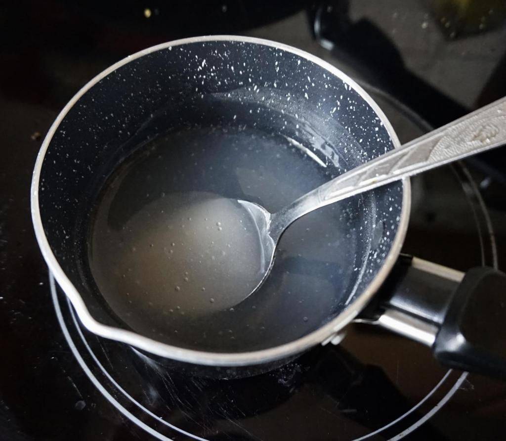 - в кастрюлю залить 850 мл воды, поставить на водяную баню, добавить желатин;