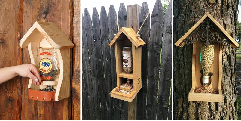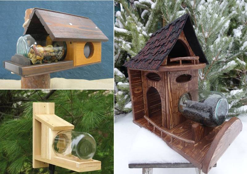 Возможно, бункерная кормушка со стеклянной банкой не так изящна, как с бутылкой из-под вина. Однако в такой конструкции очень удобно наполнять емкость кормом, да и сама по себе кормушка может быть достаточно простой.
