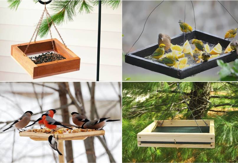 В качестве основания можно использовать обычную фанерку, но лучше использовать сетку, через которую беспрепятственно уходит влага и корм не пропадает. Плоскую кормушку можно повесить на четырех шнурах или разместить на подставке. В любом случае она должна иметь бортики, которые ограничат выдувание зерна ветром.