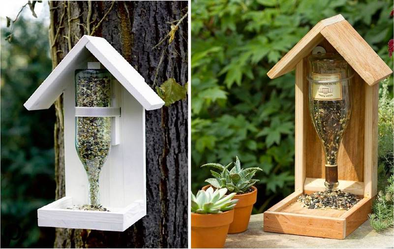 Разумеется, с применением оригинальной бутылки из-под вина получается изящное изделие. Обычно перевернутая емкость удерживается за горлышко, будучи установленной в специальное отверстие. При этом между дном бутылки и крышей «домика» оставляют достаточный зазор, чтобы емкость можно было снимать для заполнения.