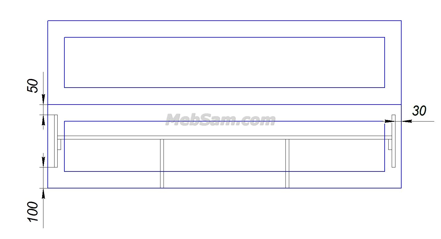 По высоте (по вертикали) царга размещена с отступами в 50 мм от верха изножья и 100 мм от низа задней спинки кровати и от изголовья (смотрите на схеме).