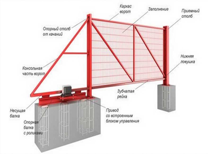 Эта конструкция хороша тем, что над проездом нет балок. Но она — самая дорогая в устройстве. Дело не столько в системе роликов, сколько в необходимости устройства фундамента с металлическими закладными, к которым затем будет крепиться консольная балка. Если столбы уже есть, фундамент заливается перед ним и вдоль забора на длину технического выноса, который необходим для компенсации нагрузки, создаваемой полотном.
