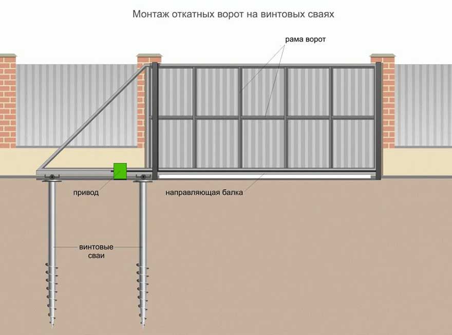 Продумывают, где будут располагаться опоры: под закладной деталью, как минимум 2 сваи, остальные выполняют функцию столбов. Две опоры предусматривают по краям проема. Такая схема обеспечит достаточную надежность конструкции. Фундамент сможет удержать подвижное полотно, если делать такую конструкцию.