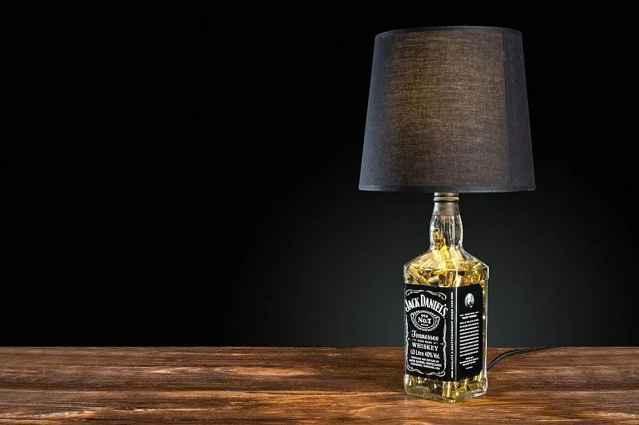 - Следом закрепил абажур к горлышку. Это можно сделать с помощью гибкой медной проволоки, которая надежно прослужит даже во время интенсивной эксплуатации ночника. В конце просто вкрутил лампочку и поставил на нужное место, лампа из бутылки готова.
