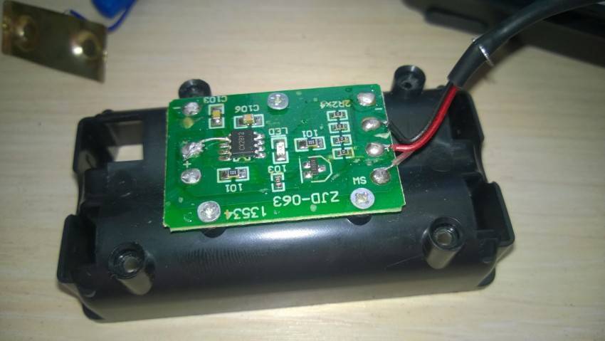 Блок зарядки делим пополам, складываем, пропаиваем разомкнутые контакты. Припаиваем регистр, подсоединяем к кнопке включателя.