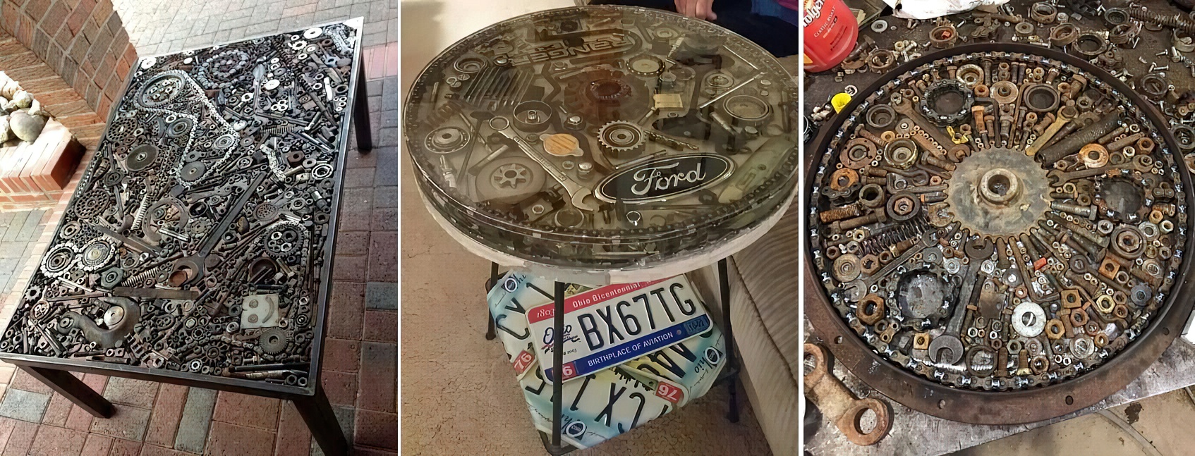 Фантазия человека безгранична. Делают мебель из эпоксидки, заливая разные железки. Детали автомобилей, гаечные ключи, велосипедные или мопедные цепи и т.д.
