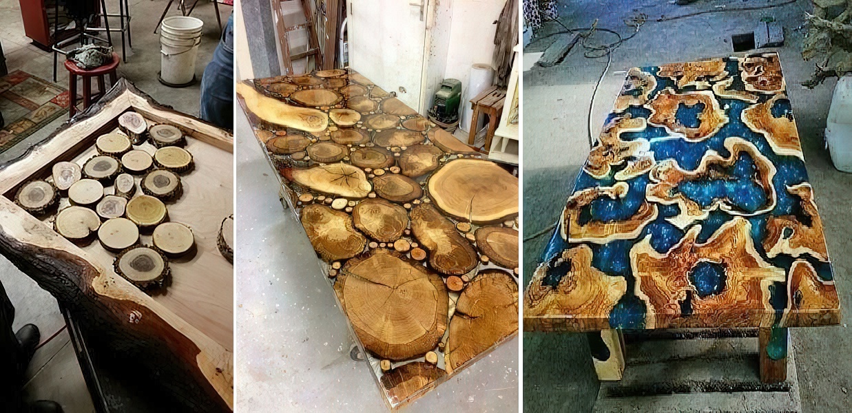 Деревянные столы с покрытием из эпоксидной смолы и разным наполнением