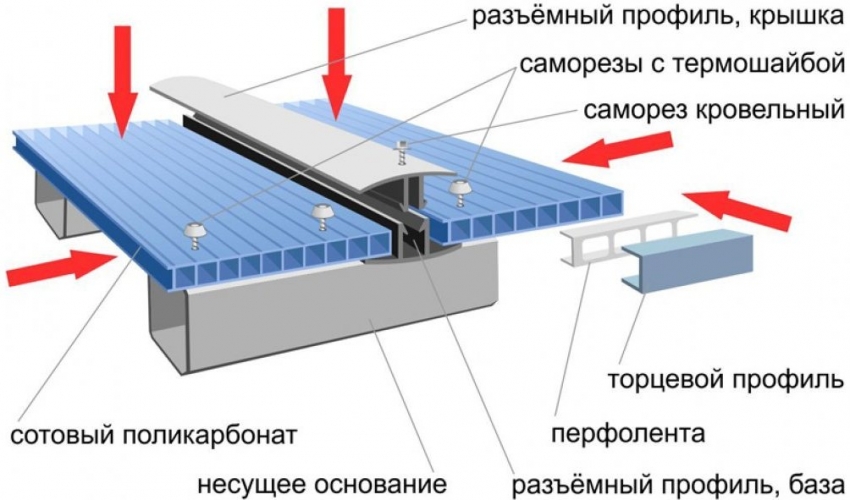Монтаж поликарбоната к металлическому каркасу с помощью разъемного профиля