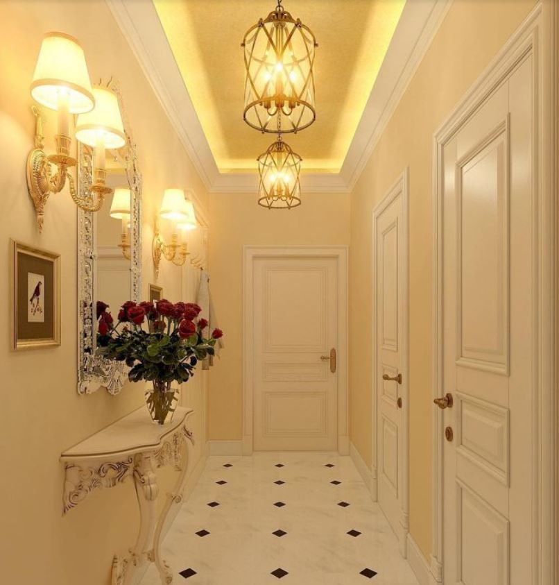 Это всегда элегантно и изысканно. Для узкого коридора больше подойдет современное классическое направление, где нет места пышному декору, но обстановка всегда покоряет комфортом и уютом. Классицизму присуща симметрия, правильные линии и натуральные материалы мебели и отделки. Коридор в классическом стиле должно украшать большое зеркало в красивой раме, дорогая люстра.