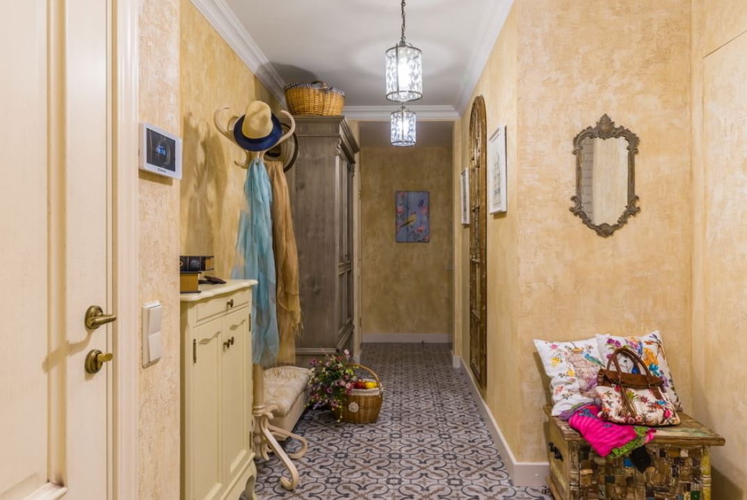Меблировку подбирают в винтажном стиле, с потертостями, нарочито состаренной краской или лаком, с кожаными или металлическими элементами. В кантри-коридоре отлично себя чувствуют коврики на полу, керамический декор, шторки на дверях. Шкаф-купе в узкую прихожую не войдет, потому его заменяют вешалкой, а вместо тумбы ставят скамейку, сундук или старинный комод.