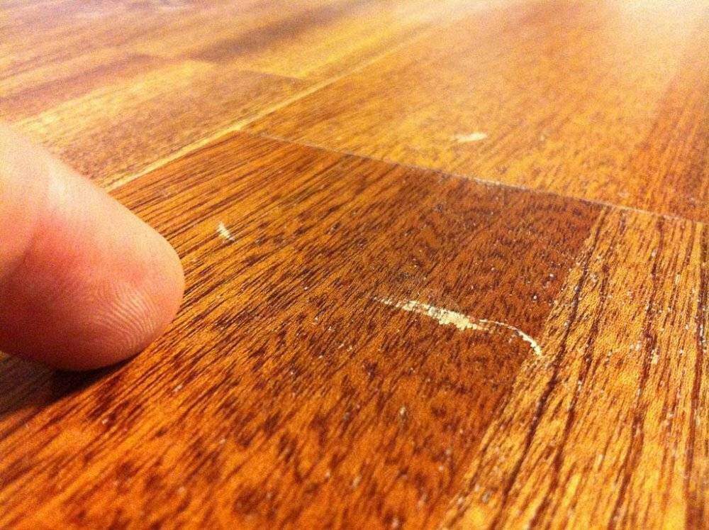 Также устранение царапин можно произвести при помощи морилки. Такие действия уместны, если при изначальной укладке это вещество тоже использовалось.