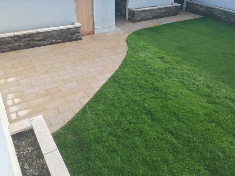 Разложите кусок дернины вдоль прямого края, например, кромки дорожки. Каждый новый рулон раскатайте и положите вплотную к соседнему.