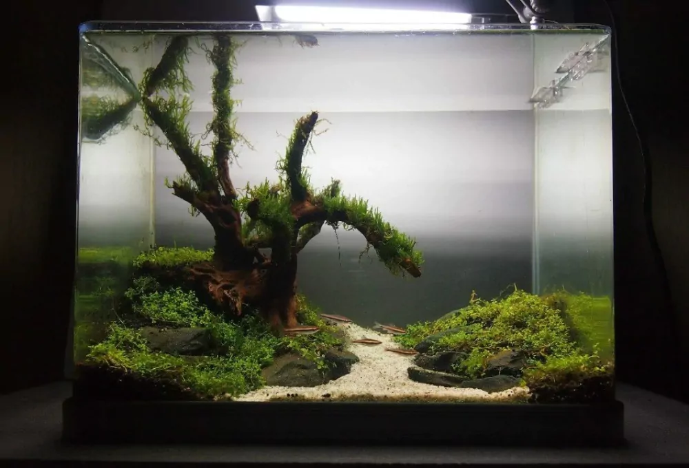 Вабикуса в аквариуме. Это минималистичный стиль, при котором создается неровность (возвышенность, кочка), погруженная в воду полностью либо частично (палюдариум), и она обязательно закрыта мхами и различными короткими растениями.