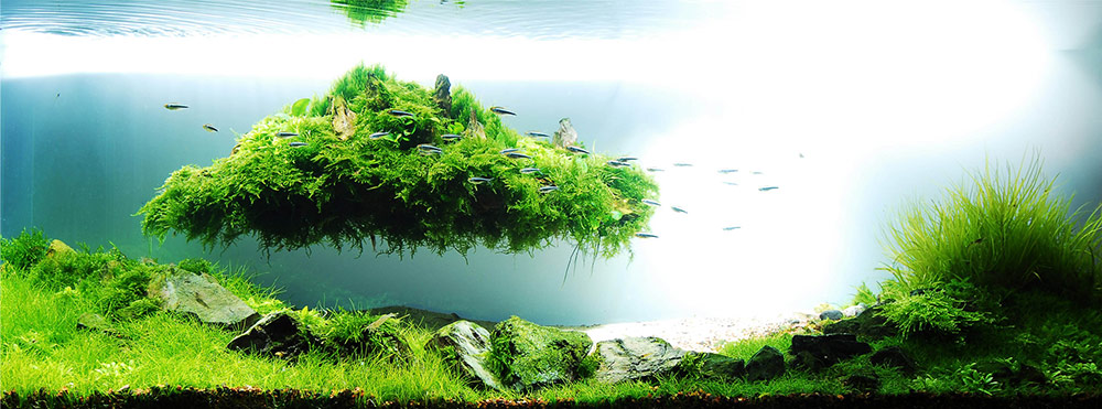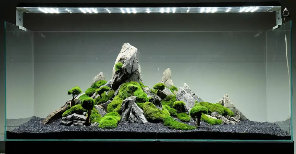 Небольшой объём подойдёт начинающему акваскейперу. Для обслуживания такого аквариума используются автоматизированные системы по очистке воды и снабжения её кислородом, что значительно облегчает уход за водоёмом.