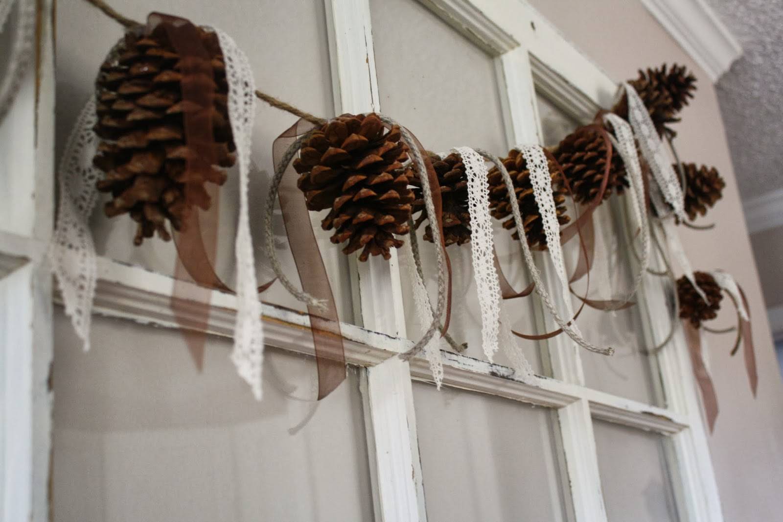 Гирлянды из шишек. Делаются они по принципу игрушек, только собрать такие поделки нужно в одну длинную гирлянду.