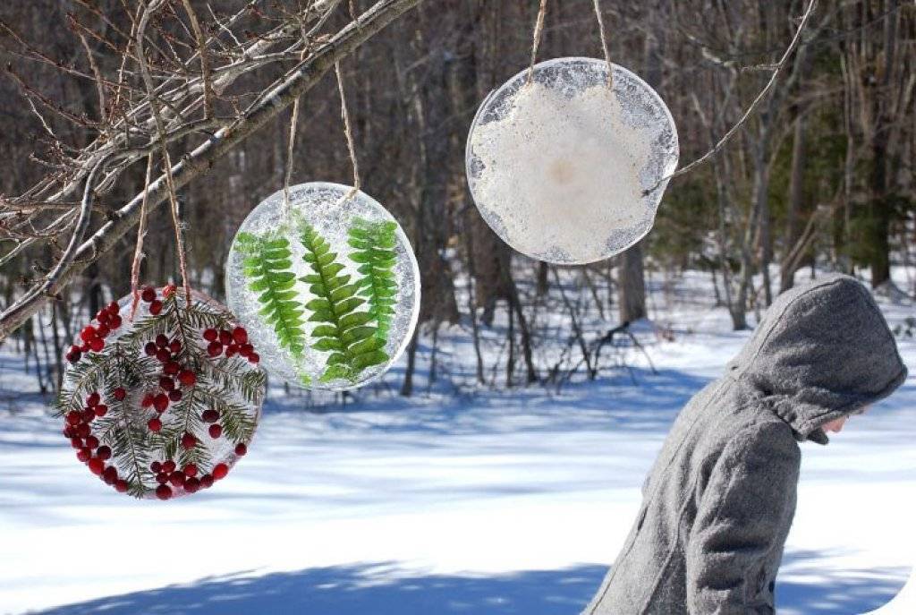 Чтобы такие украшения были более интересны, в воде можно заморозить листики, веточки от ели, шишки, ягоды шиповника или рябины. Для изготовления в формочки залить воду, добавить декоративные элементы и заморозить. Чтобы извлечь эту красоту, достаточно поставить форму на несколько секунд в горячую воду, кусочек льда выйдет сам. Такие украшения можно расставить по двору или же привязать ленточку и развесить по всей территории.