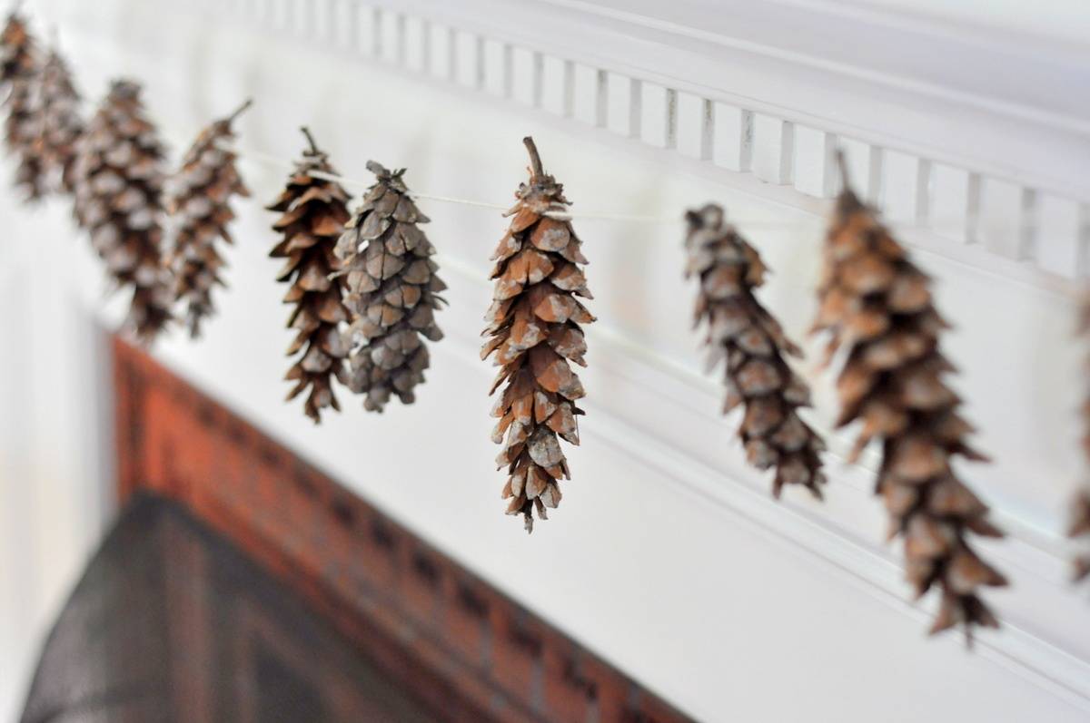 Гирлянды из шишек. Делаются они по принципу игрушек, только собрать такие поделки нужно в одну длинную гирлянду.