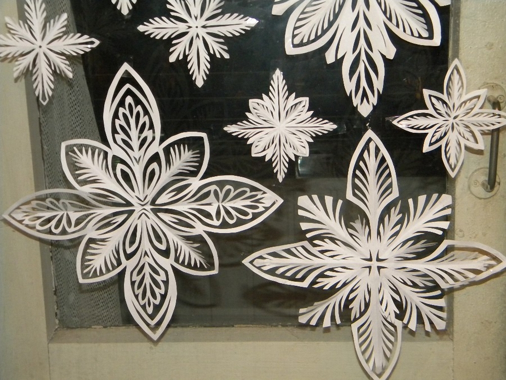 Елочные игрушки. Они бывают не только круглыми, но и плоскими из обычной белой бумаги. Вырезанные заготовки отлично будут смотреться скрепленными нитью или подвешенными к откосу;