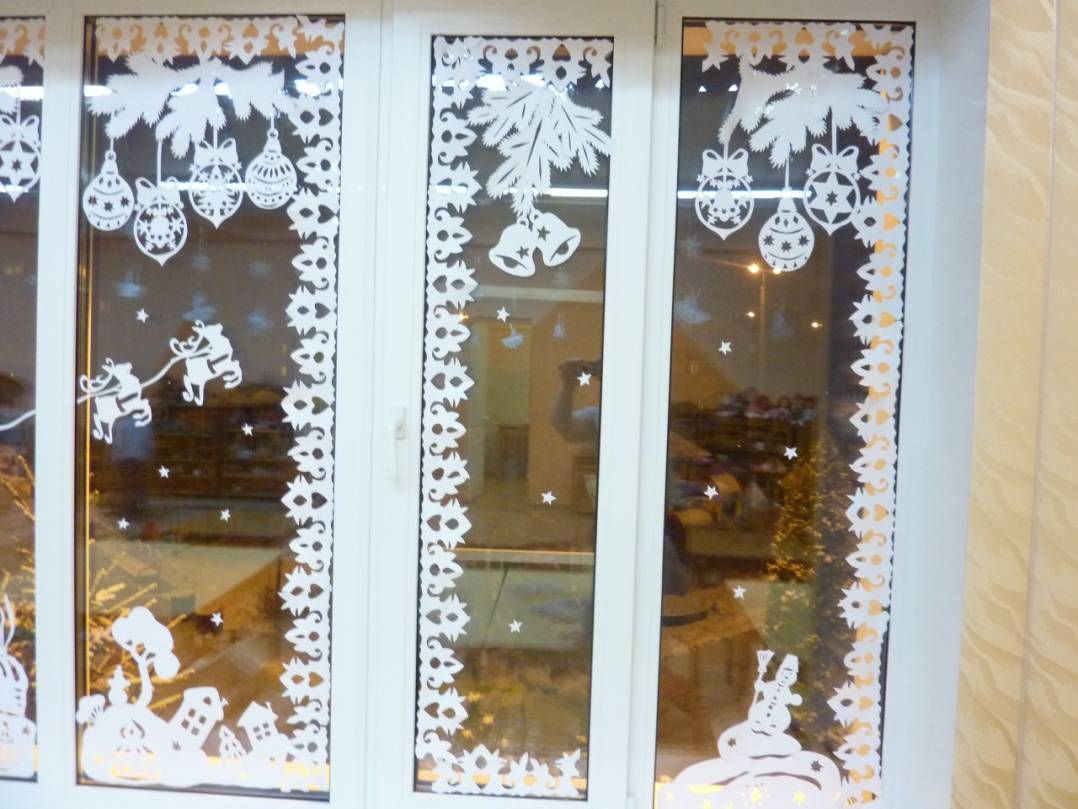 Можно: — нарисовать на стекле снежинки зубной пастой, гуашью или клеем ПВА; — распылить на стекло искусственный снег; — наклеить бумажные снежинки или специальные наклейки; — повесить на окне электрическую гирлянду; — украсить окно композицией из шариков, звезд или шишек.