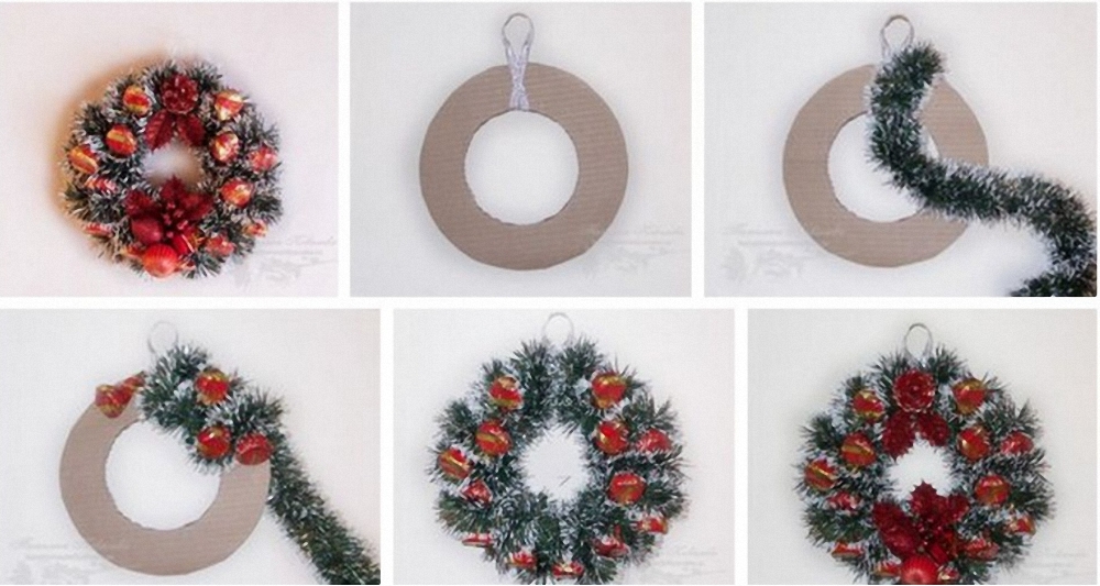 Из проволоки делают каркас, длина которого равна периметру окна. Ветки собирают в пучки и прикрепляют их с помощью проволоки к каркасу. Венок украшают бусами и ёлочными игрушками.