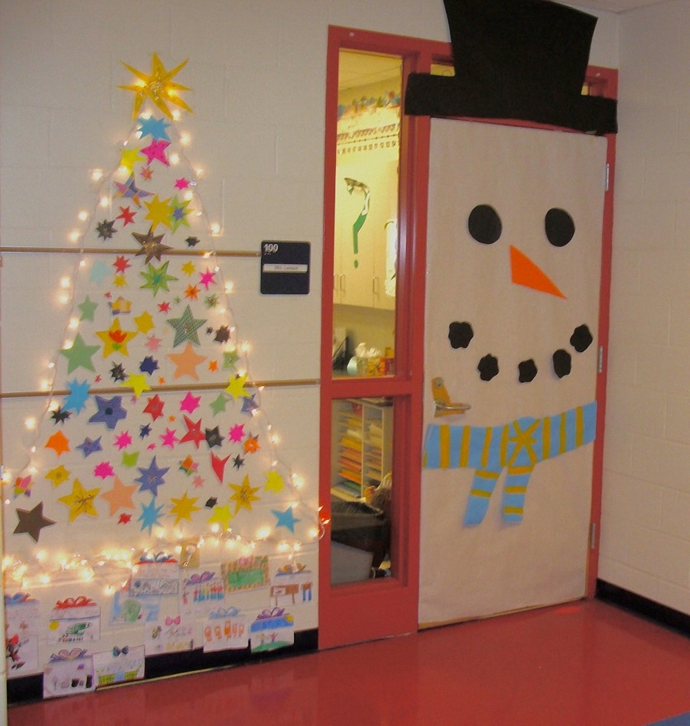Украшая дверь в группу, учитывайте ее цвет. Если она белая, то ее легко можно дополнить снеговиком из ваты или гирлянд.