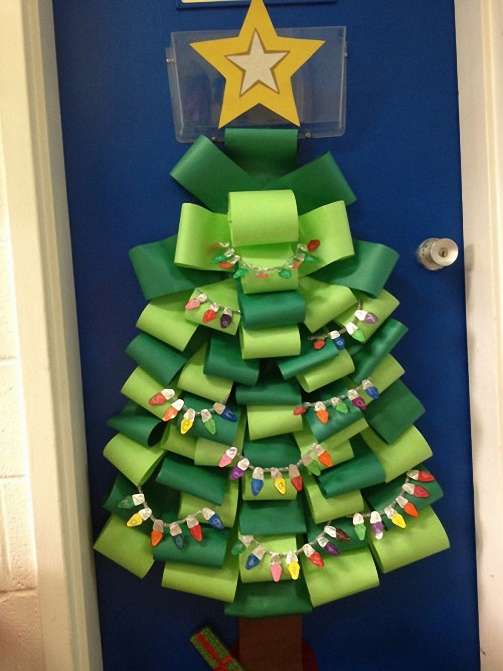 Более приемлемый вариант — создать в группе образ ёлки в виде оригинального изображения на стене. Самый простой способ — обозначить контуры деревца зелёной гирляндой.