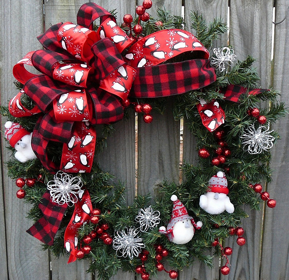 Для дверей Традиционно на двери принято вешать специальный рождественский венок, сделанный из еловых веток и украшенный бантами, игрушками, дождиком.