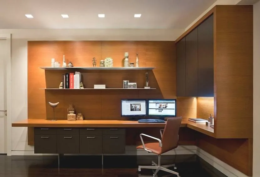 - В маленьком помещении старайтесь поставить стол лицом к оконному проёму. Если помещение не слишком узкое, то дизайн кабинета в квартире может предполагать размещение полок по всем стенам. Если в будущем кабинете нет окон, то лучше установить стол так, чтобы пользователь оказывался боком к двери.