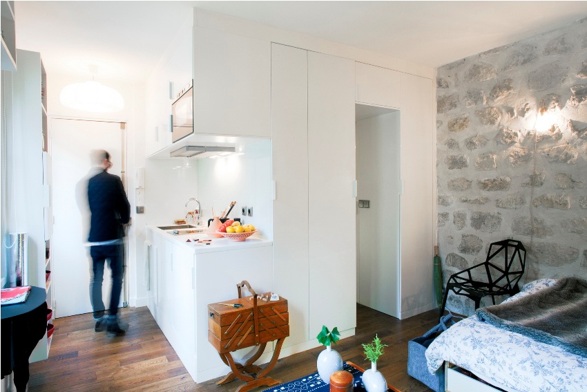 | Встроенная в функциональной нише кровать. | Является достаточно неплохим подходом, обеспечивающим ощущение уединенности, обычно дополняется удобными полочками для вещей, в которых так нуждается студия. Дизайн квартир в этом случае предполагает обустройство небольшого углубления в стене. |