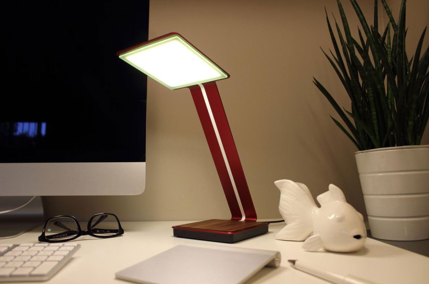 Этот прибор – само олицетворение практичности и стиля. Он отлично будет смотреться в рабочем кабинете служащего и на столе школьника. В дизайне присутствуют хромированные и кожаные детали. Ножка лампы – из гибкого каучука. Прибор регулируется с помощью сенсорного диммера.