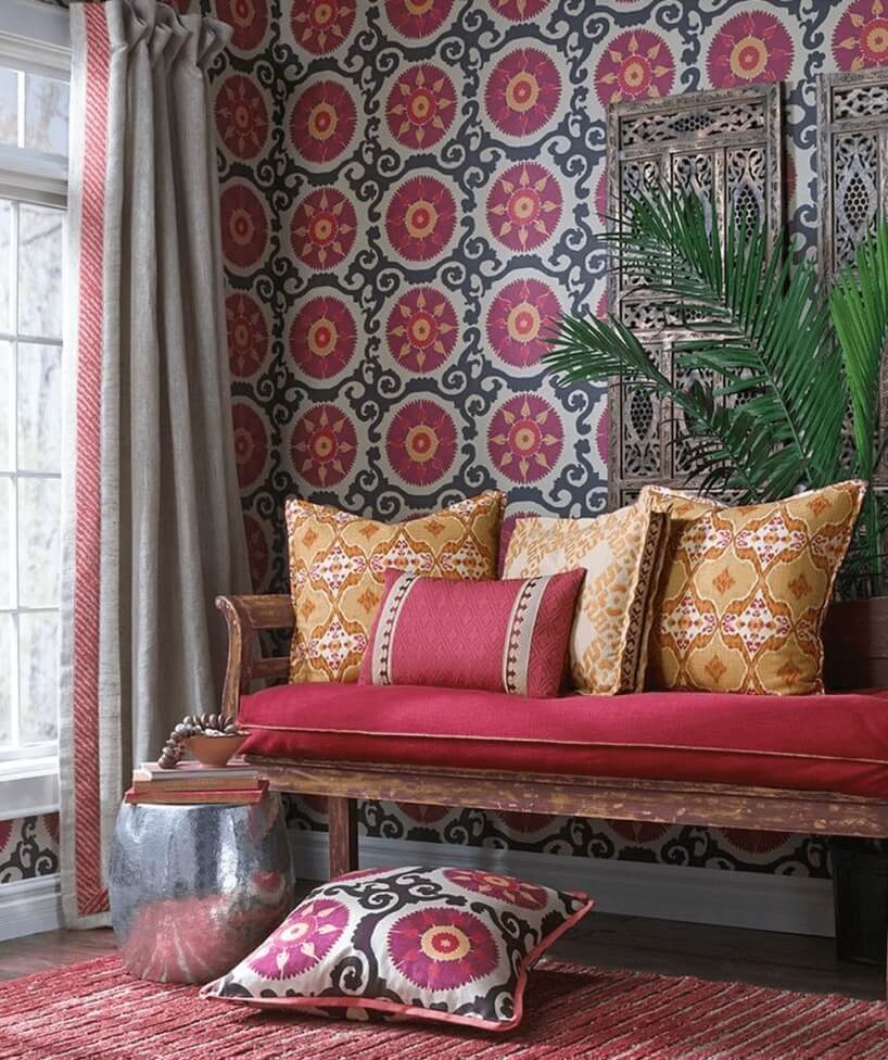 Размер узора зависит от площади помещения. В маленькой гостиной крупный орнамент будет уместен на одной стене.