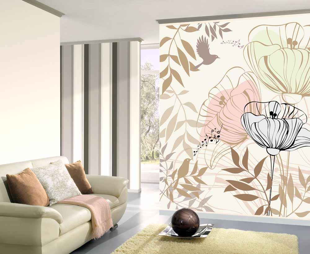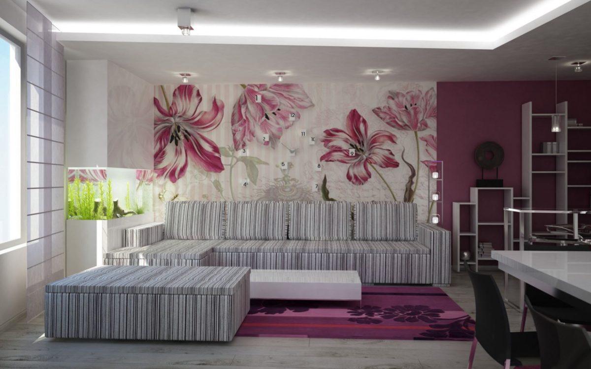 Мелкий цветочный узор прекрасно смотрится в небольших помещениях. Для гостиной также подойдут современные обои с крупными изображениями, которые образуют красочный орнамент. Ими лучше оклеить одну или две стены, но не всю комнату.