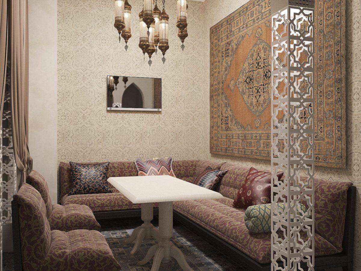 Культурные тенденции Востока довольно часто используют в интерьере гостиной. Однако шпалеры с подобными рисунками гармонично смотрятся только в соответствующей обстановке. Это относится к предметам мебели, осветительным приборам, текстильным изделиям, аксессуарам.