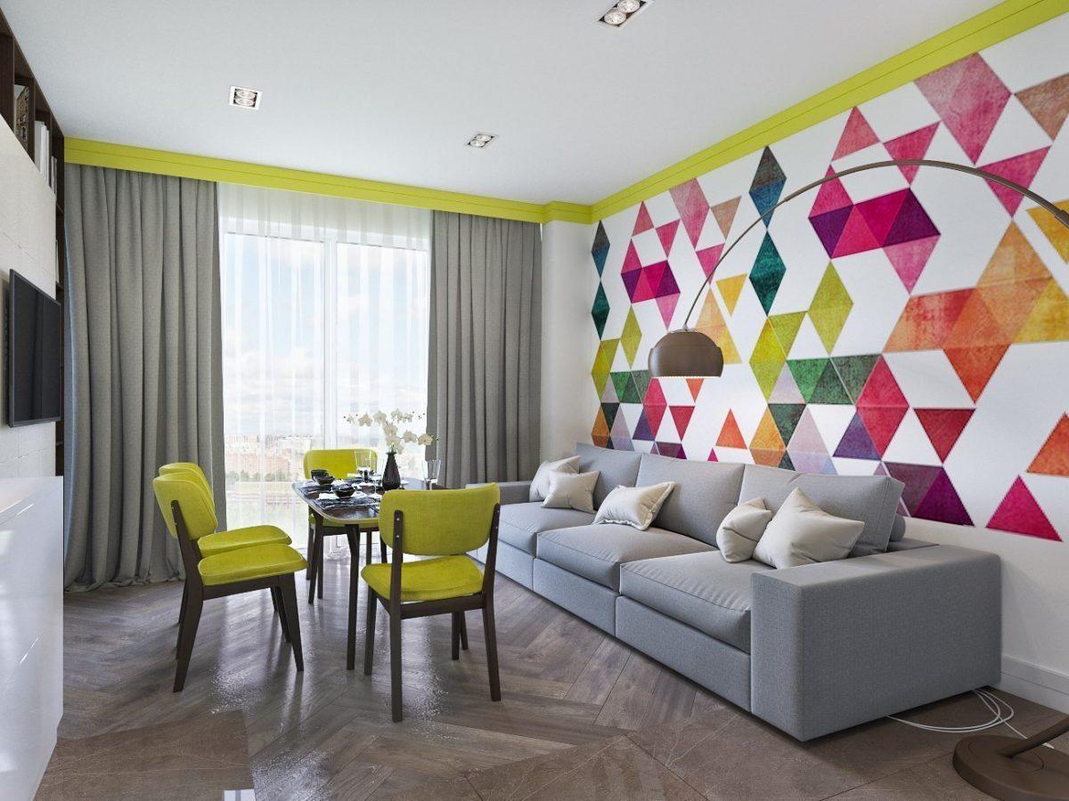 Рисунки, составленные из геометрических фигур различной конфигурации, всё также востребованы. С их помощью можно визуально раздвинуть стены или приподнять потолок.