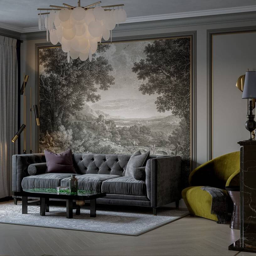 Здесь подойдет имитация настенной живописи, изображающей природу или исторические события. Для декорирования стыков используют молдинг или полиуретановую лепнину.