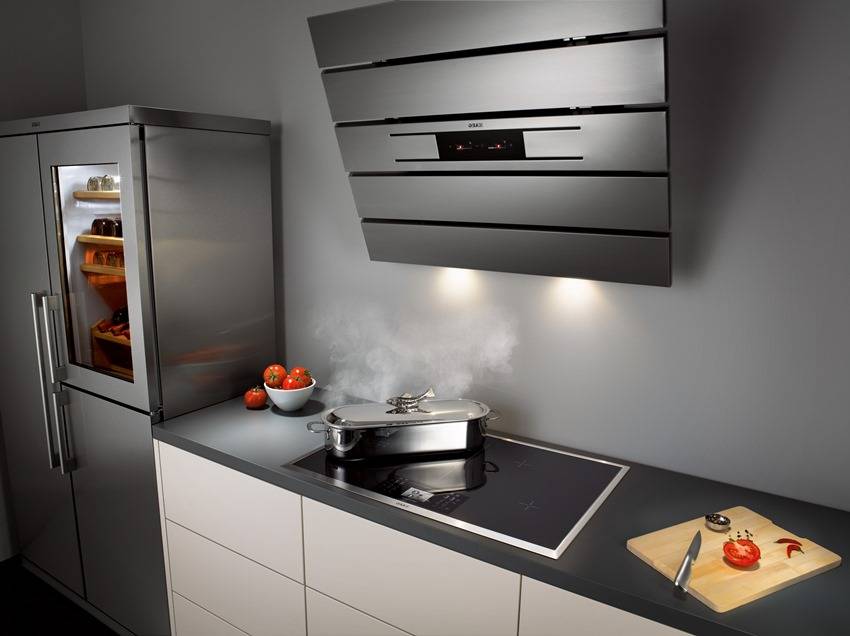 - Легче всего ухаживать за вытяжками из металла, а также за приборами светлого оттенка, например, металлик или белого цвета.