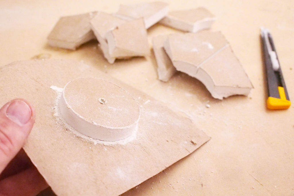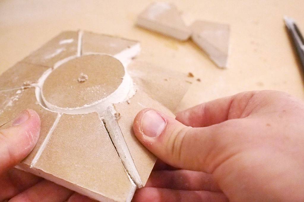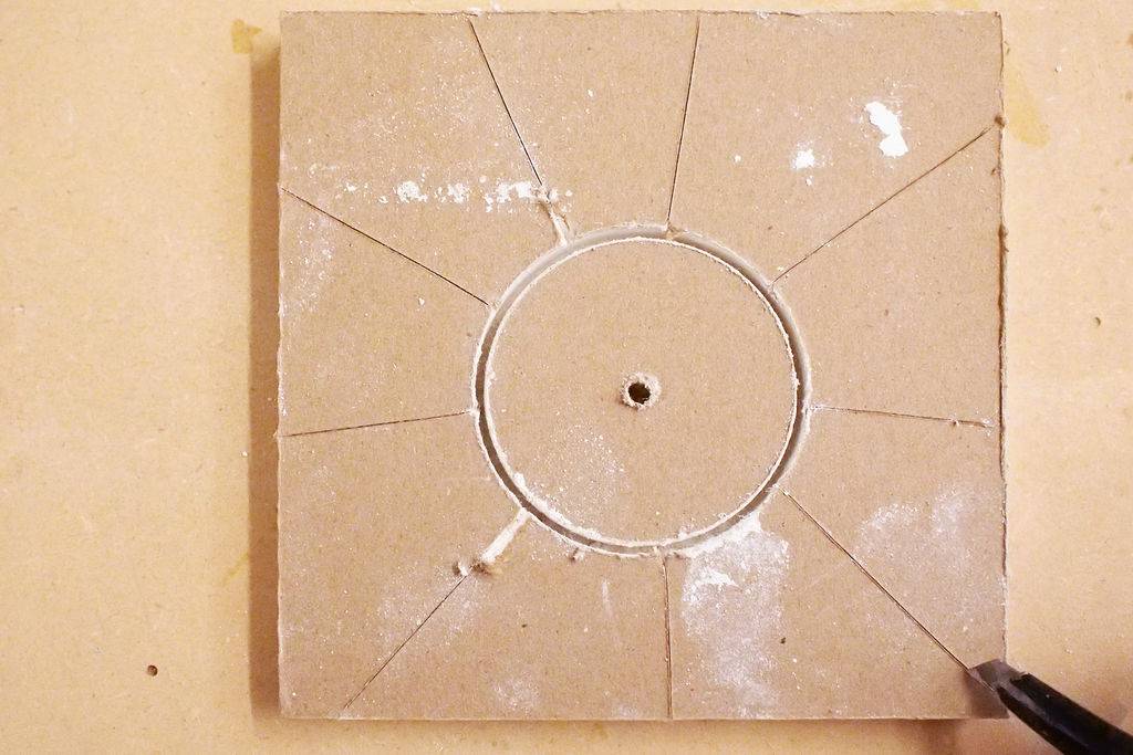 Сделайте радиальные надрезы от кромки вставыша к краям куска гипсокартона. Надрезы не должны быть достаточно глубокими, чтобы гипсовый слой можно было надломить руками.