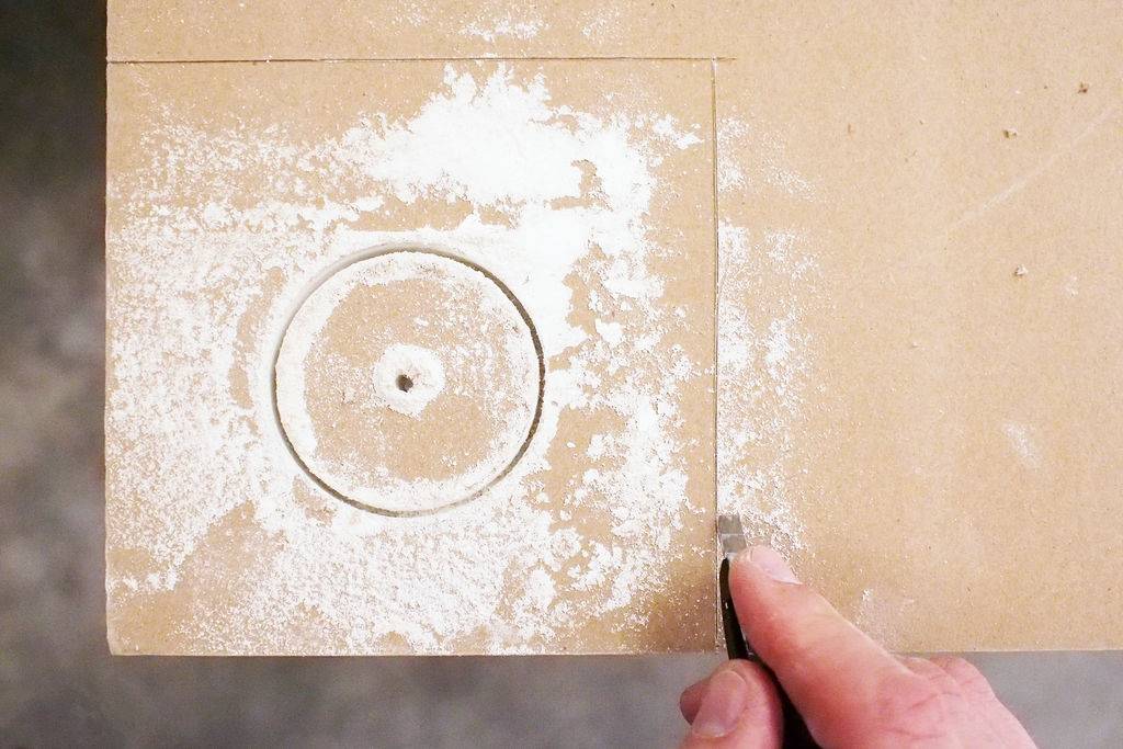 Получить вставку идеально подходящую под выпиливаемый проем можно не только обводя ее по контуру. Если дырка небольшая, вставку можно высверлить в поверхности обычной «коронкой» — насадкой для дрели. Внутри насадки останется вырезанный круг, а само отверстие будет круглой формы. Совместить эти две детали будет просто.