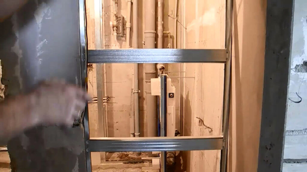 Стоечный профиль используется для того, чтобы заполнить дверной проем. Для этого по ширине прохода требуется вырезать куски, чтобы они смогли соединить противоположные вертикальные детали, сформировав единую плоскую раму. При помощи саморезов их закрепляют в местах стыков. У каркаса есть крайние горизонтальные элементы, которые требуется прижать плотно к верхнему и нижнему торцам, а внутренние разместить на расстоянии 40-50 см друг от друга. Если потребуется сделать конструкцию более жесткой, то стоечный профиль используется для формирования дополнительных вертикальных стоек, чтобы сделать решетчатую структуру.