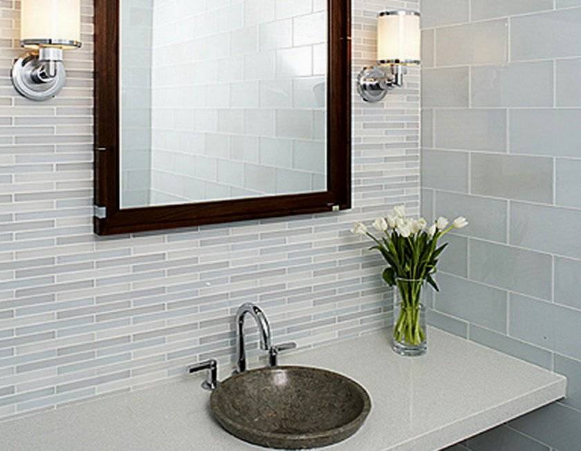 Раскладка классическая. Размер плитки — любой. Но лучше смотрится малоформатная на стенах, крупноформатная на полу