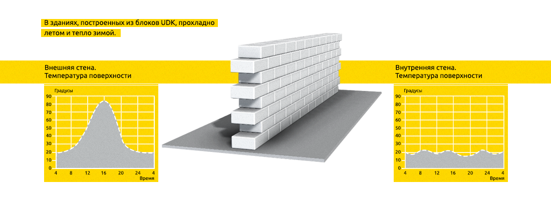 Летом, наружные части здания подвержены нагреву и высоким колебаниям температуры. Для создания прохладного, комфортного микроклимата в помещениях зданий, колебания температуры внутри здания, должны быть уменьшены до минимального уровня. Благодаря выгодной комбинации теплоизоляционных качеств и низкой тепловой инерционности, наружные стены из блоков UDK обладают способностью сведения к минимуму колебания температуры внутри помещения, при значительных ее колебаниях снаружи.