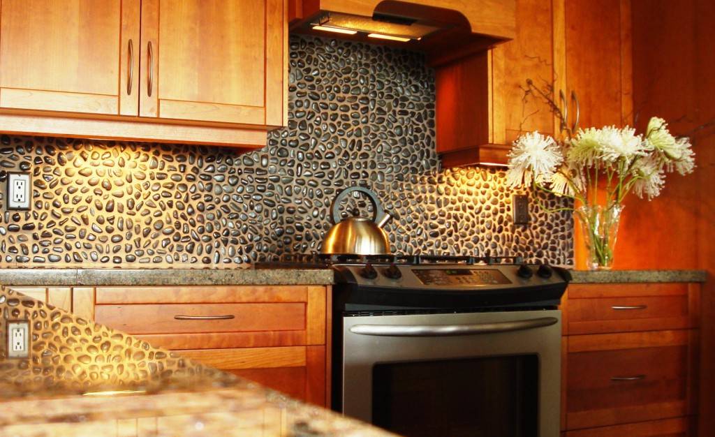 Каменными фрагментами на кухне выкладывают только фартук или обеденную зону. Для фартука рекомендуется использовать бежевый мрамор или другие гладкие элементы такой расцветки. В обеденной зоне гармонично будет смотреться материал с ярко выраженной фактурой.
