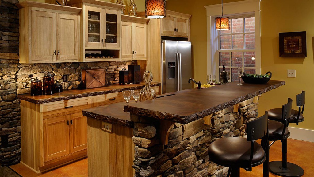 Коричневый обойный материал и каменная облицовка на кухне