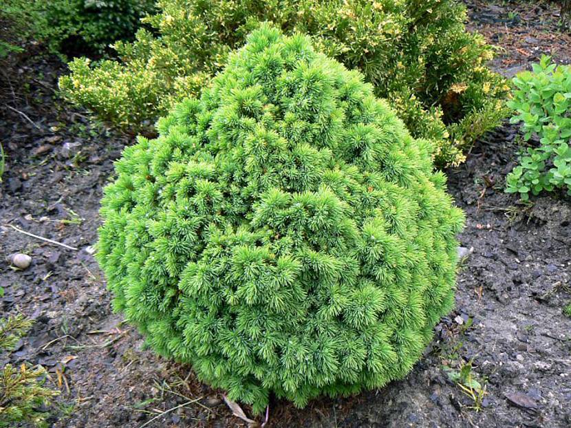 Еще один низкорослый сорт ели, подходящий для Подмосковья. Крона растения шаровидная, сизая, со слегка уплощенной верхушкой. Чтобы формировать ель и придать ей характерную форму, нужно удалять прямостоячие побеги. В диаметре карликовая разновидность достигает 60-90 см.