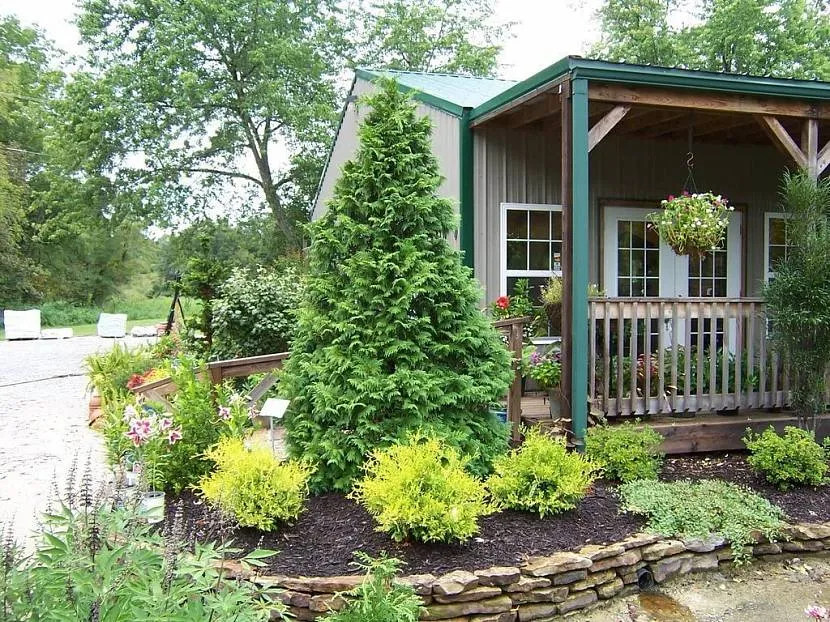 Главный вход дома можно украсить клумбами с цветами и хвойными растениями, главную роль среди которых обязательно отвести вечнозеленому конусу канадской ели