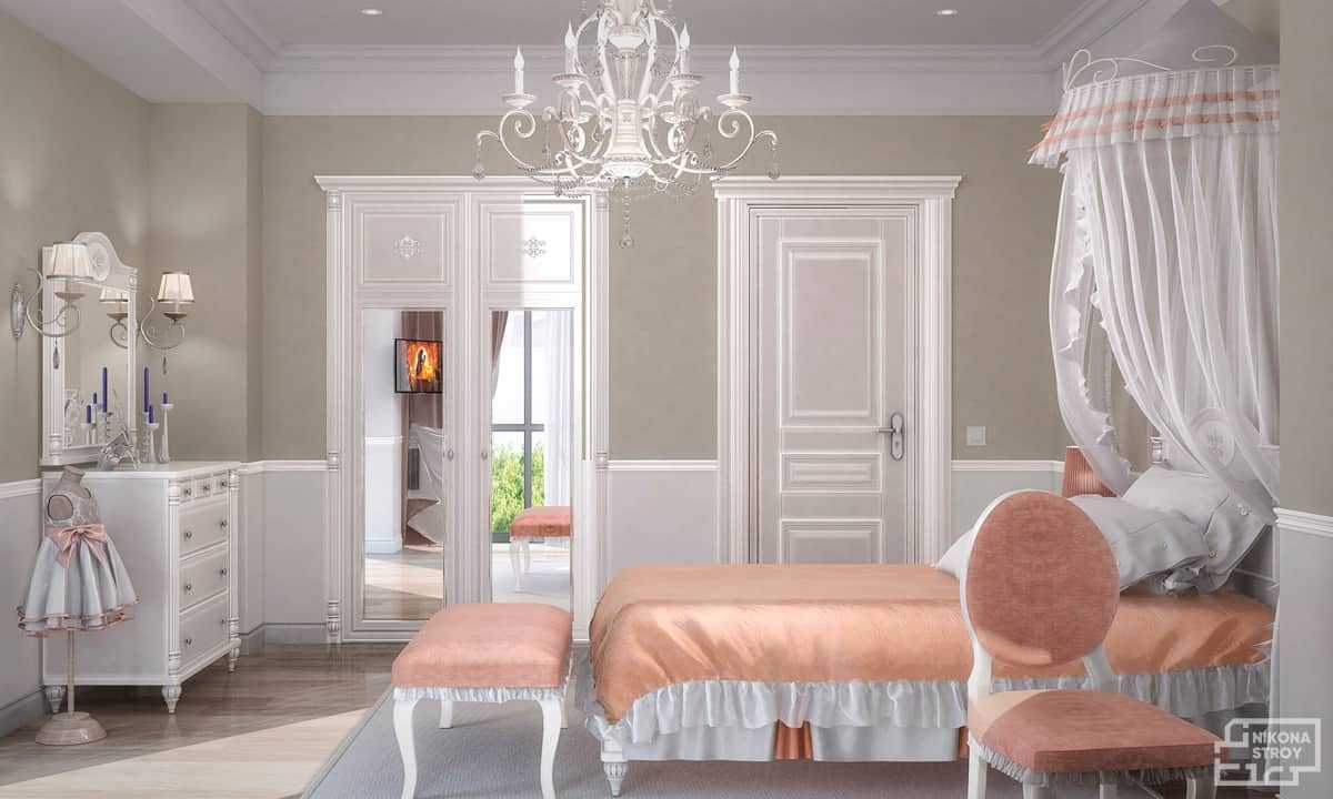 Предпочтительная палитра для стен, мебели, текстиля: молочный, бежевый, серый, белый, кремовый, персиковый, мятный. Избегайте темного дерева, белые предметы интерьера уместнее — например, кровать с белым кованым изголовьем станет центром комнаты девочки.