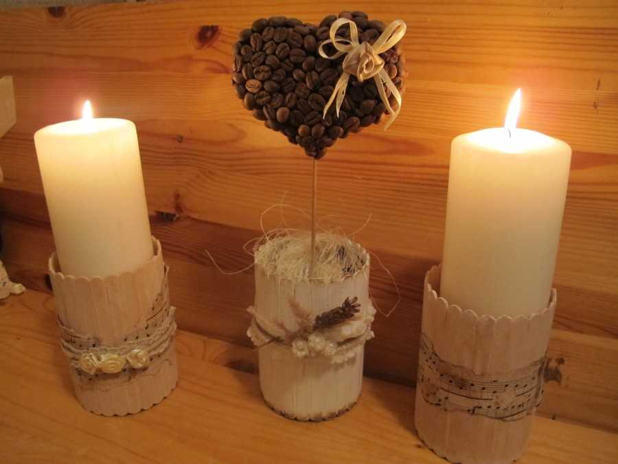 Можно сделать уникальные декоративные свечи из воска или геля. Воск получается после переплавки обычных наиболее дешёвых белых или жёлтых свечей.