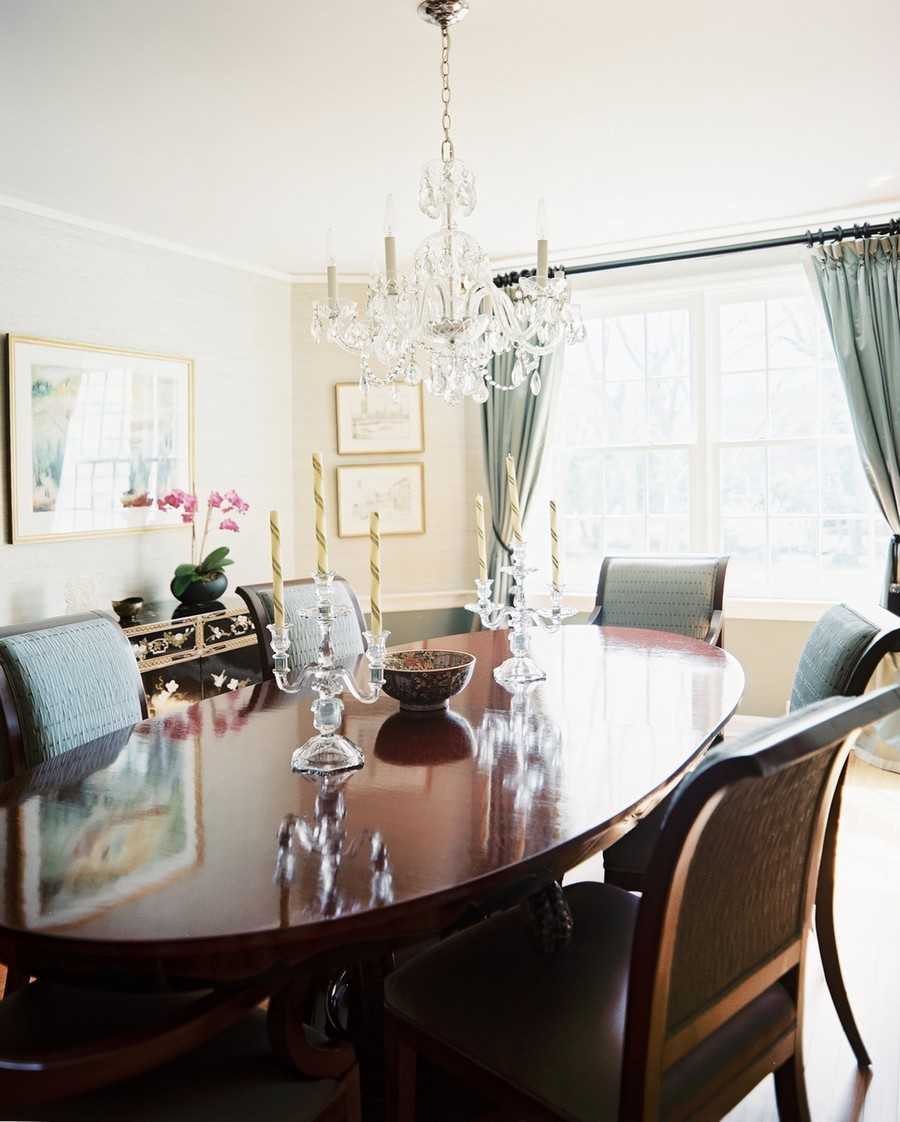 В кухне-столовой по центру устанавливают стол со стульями, над ним вешают громоздкую люстру. Подробности оформления кухни читайте в нашей статье.